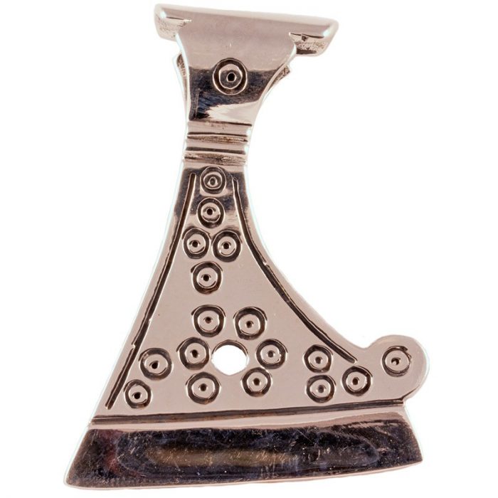 Dieses Axtamulett (925er Silber) ist eine exakte Kopie des Originals, gefunden in Rinkaby/Schonen (Schweden). Nordisch-baltische Form mit langgezogenem Helmdach und den typischen Kreisaugen, Größe 5 x 4 cm, sehr massiv und schwer, ein wunderschönes Stück.