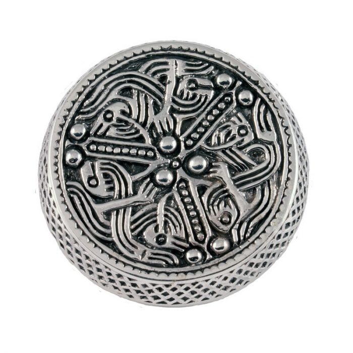 Dieses Dosenfibel (925er Silber) Original wurde auf Gotland gefunden und stammt aus der Zeit um 700-750 n. Chr., es handelt sich um eine runde Fibel oder Dosenfibel, da sie einen hohen Rand besitzt und innen hohl ist, diese Fibelform ist typisch für diese Zeit. Die Oberfläche ist mit verflochtenen Tieren verziert, der Rand weist eine umlaufende Bandornamentik auf.