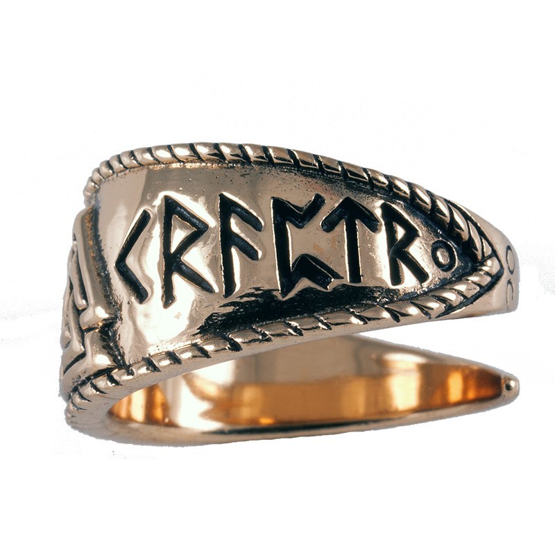 Verstellbarer Valknutring (Bronze 52-60 klein) mit großer Bedeutung, in der Mitte der Valknut-oder Wotansknoten, symbolisiert die Kraft des Gottes Odin (Wotan), kombiniert mit der Runeninschrift “Dorrudr Kraptr”(altnordisch), übersetzte Bedeutung “Odins übernatürliche Kraft”, ein kraftvoller und massiv gearbeiteter Ring.