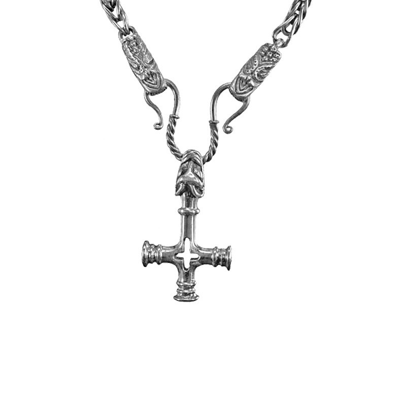 Handgeflochtene Wikingerkette (925er Silber) mit Drachenköpfen so wie sie in vielfacher Form in der Wikingerzeit getragen wurde. Länge ca. 55 cm (nur Kette), die Stärke der Kette beträgt etwa 5-6 mm (Abweichungen können vorkommen da Handarbeit).Die Drachenköpfe dieser Kette weisen eine funktionelle Besonderheit auf, die Mäuler des Kopfes sind leicht geöffnet, somit kann ein Anhänger der schon mit einem Ring versehen ist wie z.B. VP-68 S, einfach angebracht werden, indem der Ring in das Maul gelegt wird, danach wird das Maul mittels einer Zange zusammengedrückt und somit geschlossen, hält bombenfest!